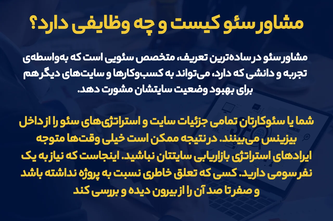 قبل از اینکه سراغ معرفی لیست بهترین مشاوران سئو ایران برویم، بد نیست از این صحبت کنیم که مشاور سئو کیست و چه شرح وظایفی دارد؟ در حقیقت مشاوران سئو وضعیت سایت شما را از تمامی زوایا بررسی کرده و ایرادهای آن را از نظر سئوی تکنیکال، سئوی داخلی و سئوی خارجی میبینند. سپس با توجه به وضعیت سایت و در نظر گرفتن سایر رقبا، راهکارهایی را برای رفع این ایرادها ارائه میدهند.